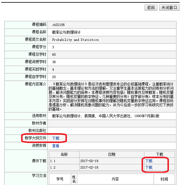 点击【个人课表】里的【课程名称】,可下载课程教学大纲以及任课教师上传的本课程的课件、习题等学习资料。