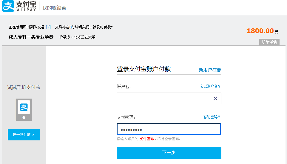 方式二:登录账户付款:点击右边登录账户付款,出现如下界面
