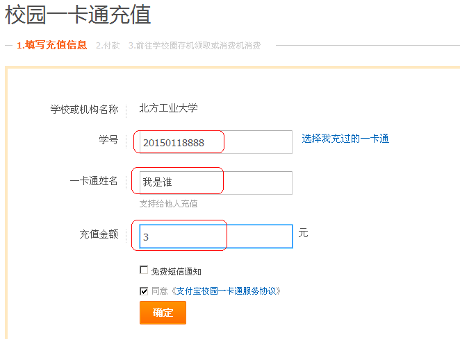 6、填写【学号】、【姓名】、【充值金额】,点击【确定】