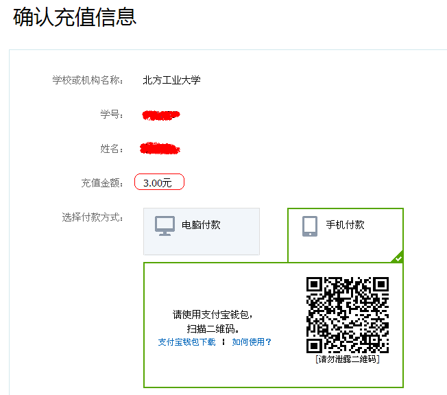 7、确认【学号】、【姓名】、【充值金额】无误后,进行付款操作